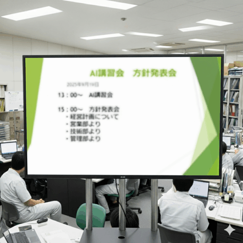 さっそく、今回、AI講習会で学んだことを活かして、経営方針発表会とAI講習会の様子を「生成AI」を用いて画像作成してみました。